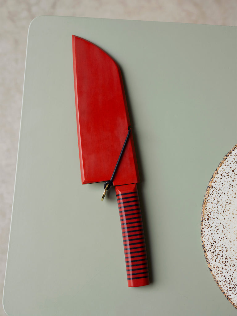 Un estuche artesanal de micarta, también conocido como Saya, con sistema de bloqueo elástico para proteger tus cuchillos de rayones y humedad, y mantener el filo intacto. Compatible con nuestro Chopper.