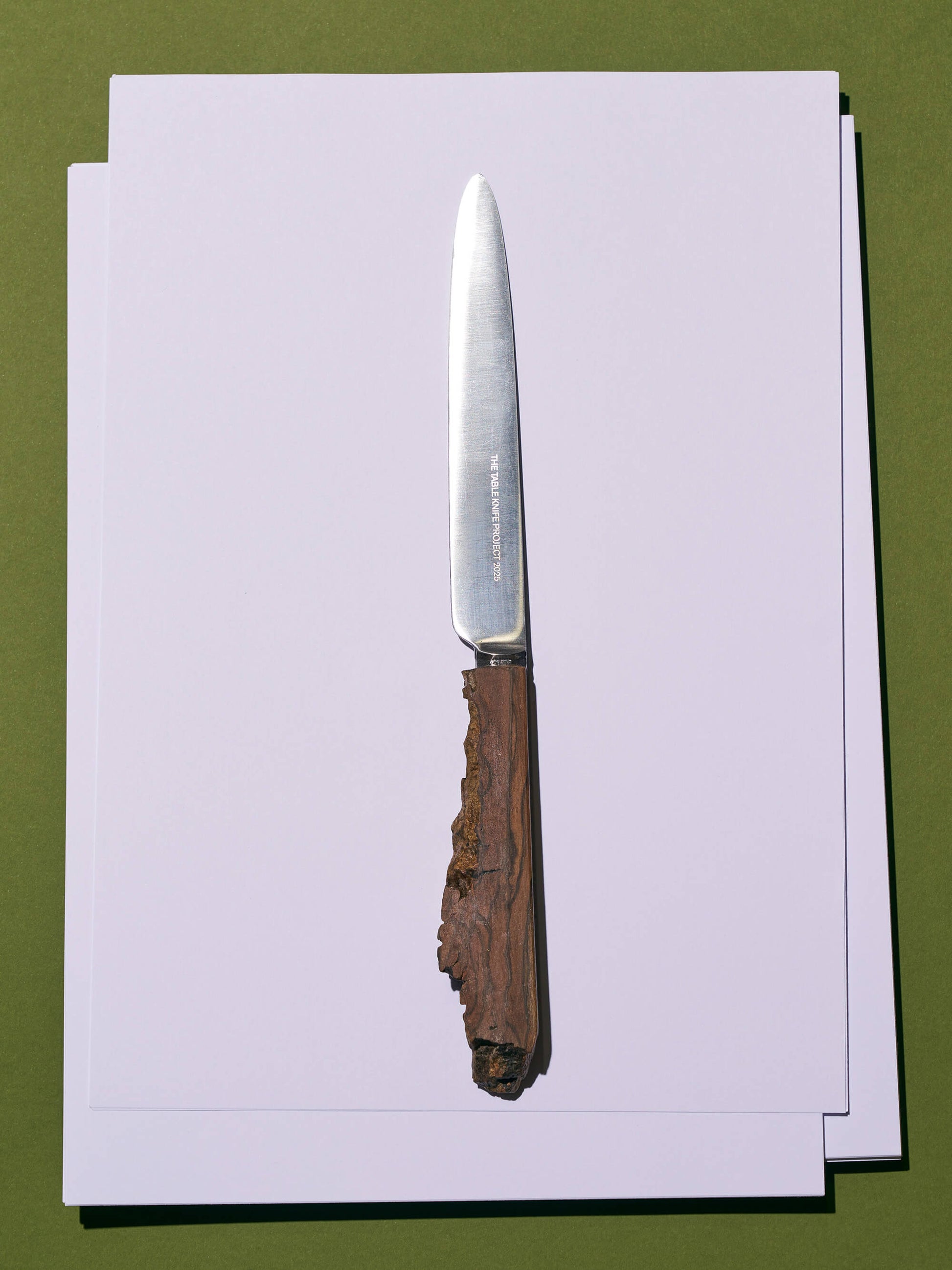 Cuando nos dieron las instrucciones para la cuarta edición del Table Knife Project, estábamos haciendo bandejas de madera con una tabla de nogal con corteza. Los retales exteriores con corteza, que quedaron de la fabricación de las bandejas, eran demasiado interesantes como para tirarlos a la basura. De hecho, tenían el tamaño perfecto para mangos de cuchillos. El intrincado patrón del corte transversal, creado por la formación de capas de corteza, era como si revelara una transmisión secreta del bosque. Y el contraste entre los lados lisos del corte transversal y las complejas texturas rugosas del exterior resultaba agradable al tacto.