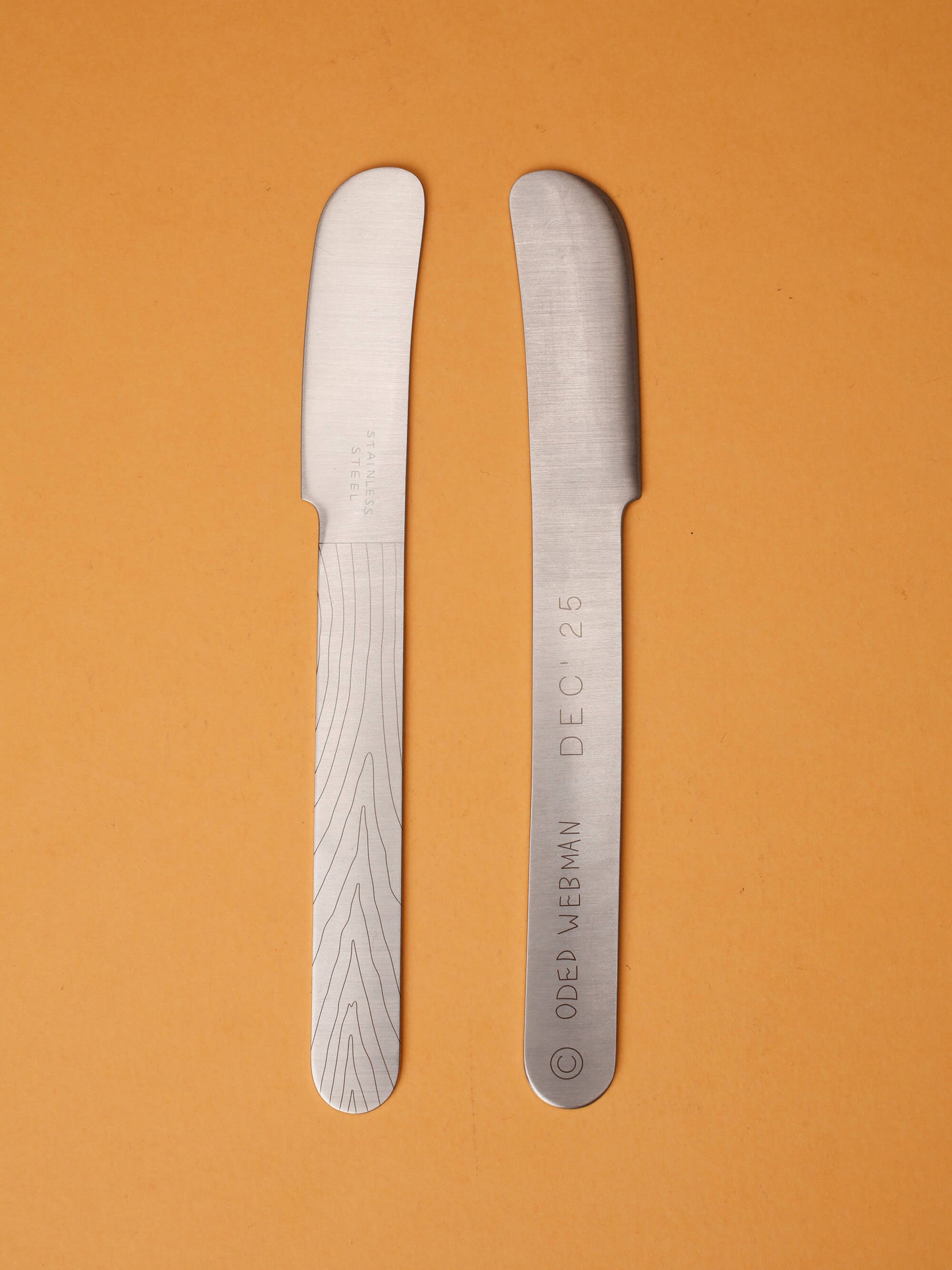 Estos pequeños pero imponentes cuchillos de acero macizo son un elegante complemento para tu mesa de comedor. Fabricados en acero inoxidable dulce de 3 mm de espesor, con hojas rectificadas a mano y un acabado satinado grueso, se componen de solo dos piezas entrelazadas, unidas por fricción y con tolerancias de alta precisión.