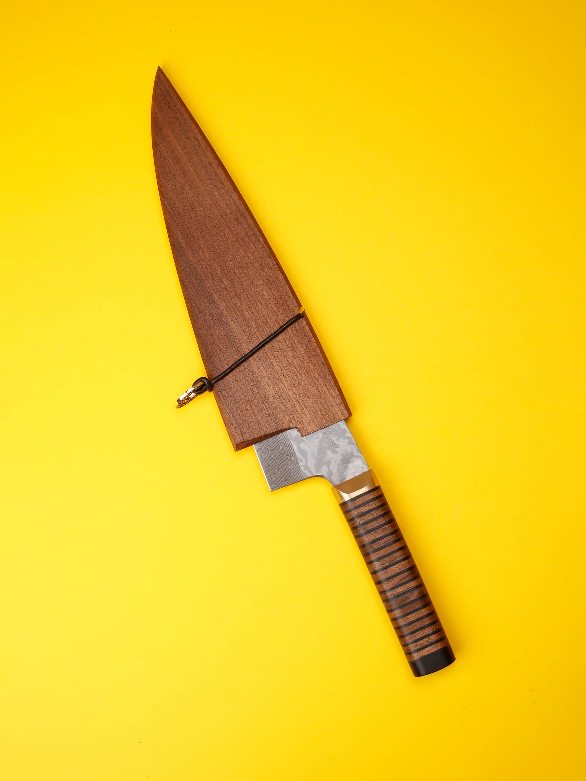 The handle is built from alternating thin layers of black leather and Walnut discs, finished with a brass bolster, black Micarta pommel, and brass rivet - a classically balanced composition that complements the complexity of the steel. A beautiful Walnut blade guard with red felt lining is also included with this knife.