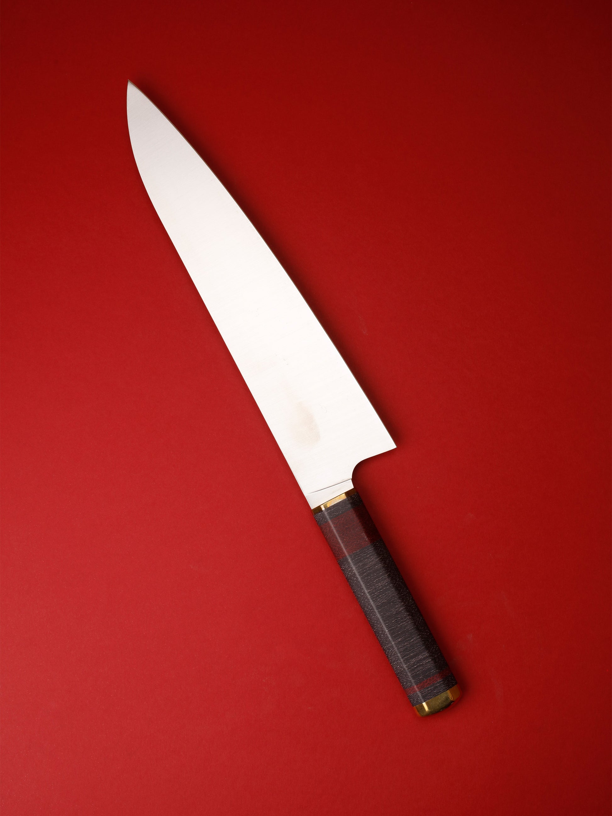 The Kedma Gyuto knife is a large all purpose kitchen knife. Long (240mm) and tall (57mm) and can be used for most cutting board tasks. These knives have a thinner, lighter and harder blade than most western equivalents. They work extremely well for slicing meat and fish. Our original design, an octagonal handle with stacked discs assembled around the tang of the blade.